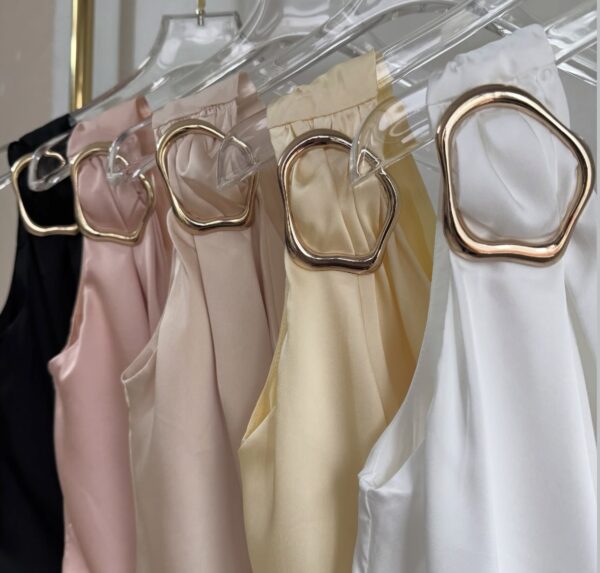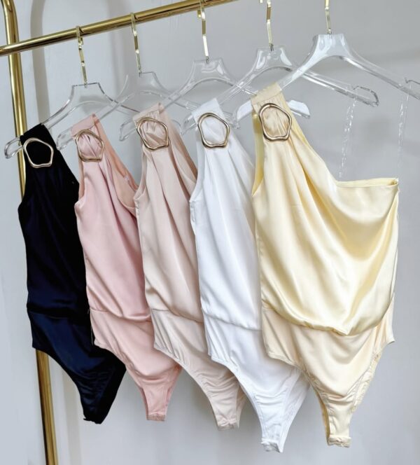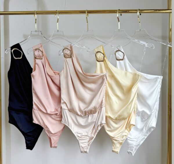 Body de satén , asimétrico, con cierre lateral, detalle de hebilla dorada. Trae prendidura inferior.