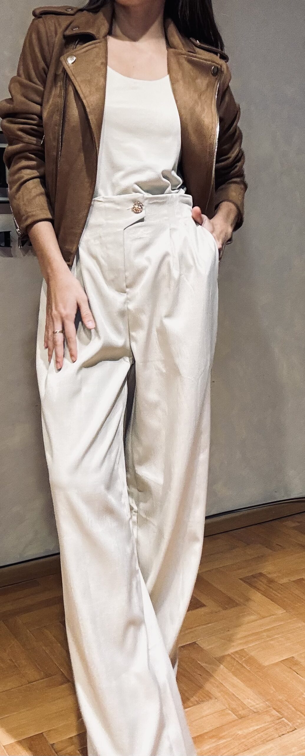 Jacket gamuzada con forreria interna, cinto desmontable y cierres.