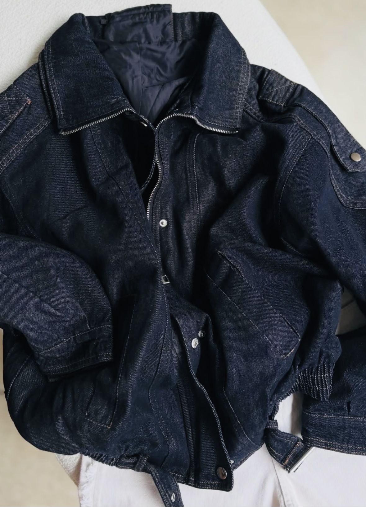 Jacket over de Jean, con forreria interna, bolsillos, elástico en cintura, cierre frontal y broches. Abarca desde S al XL.