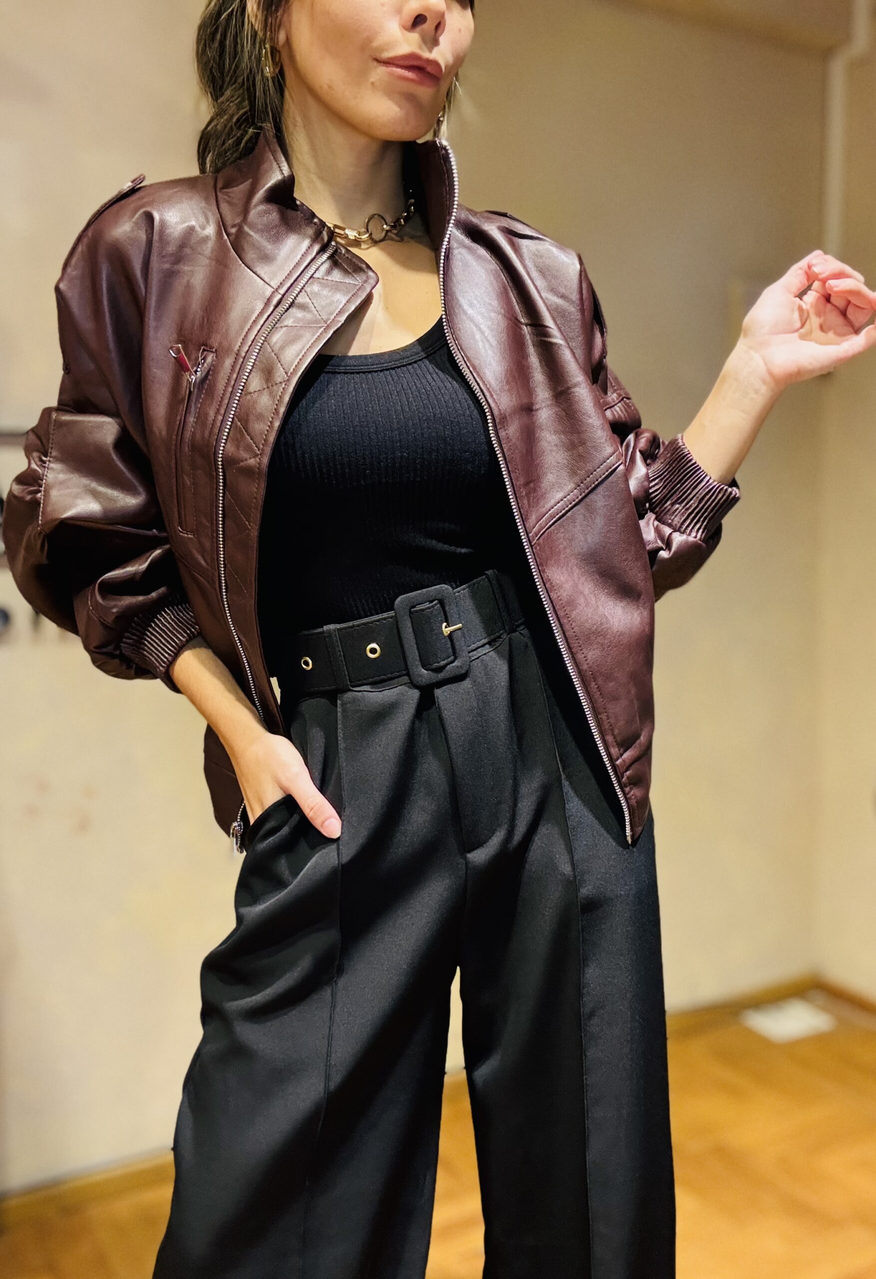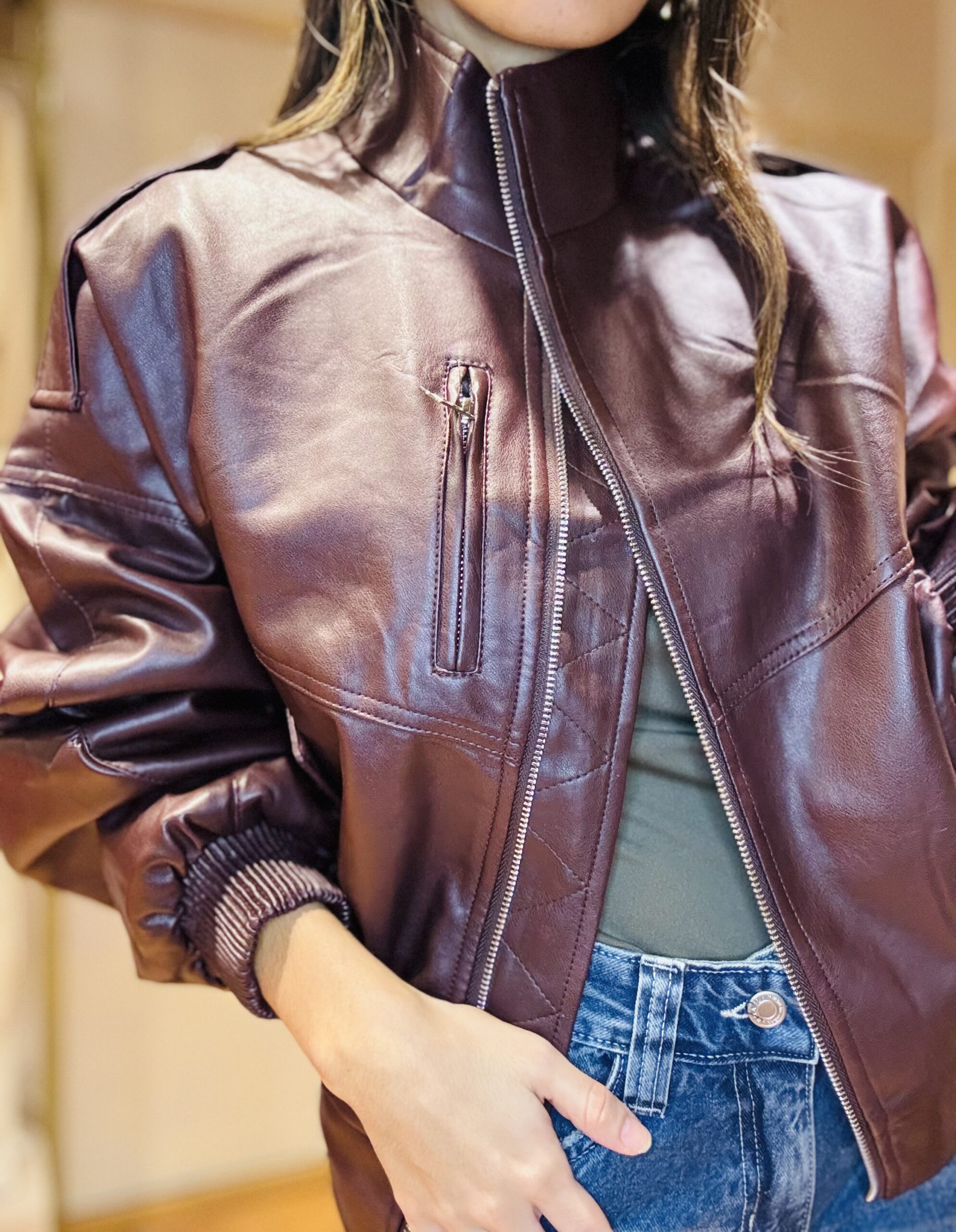 Jacket símil cuero, con forreria interna, cierre frontal, bolsillos laterales, elastizada en cintura.