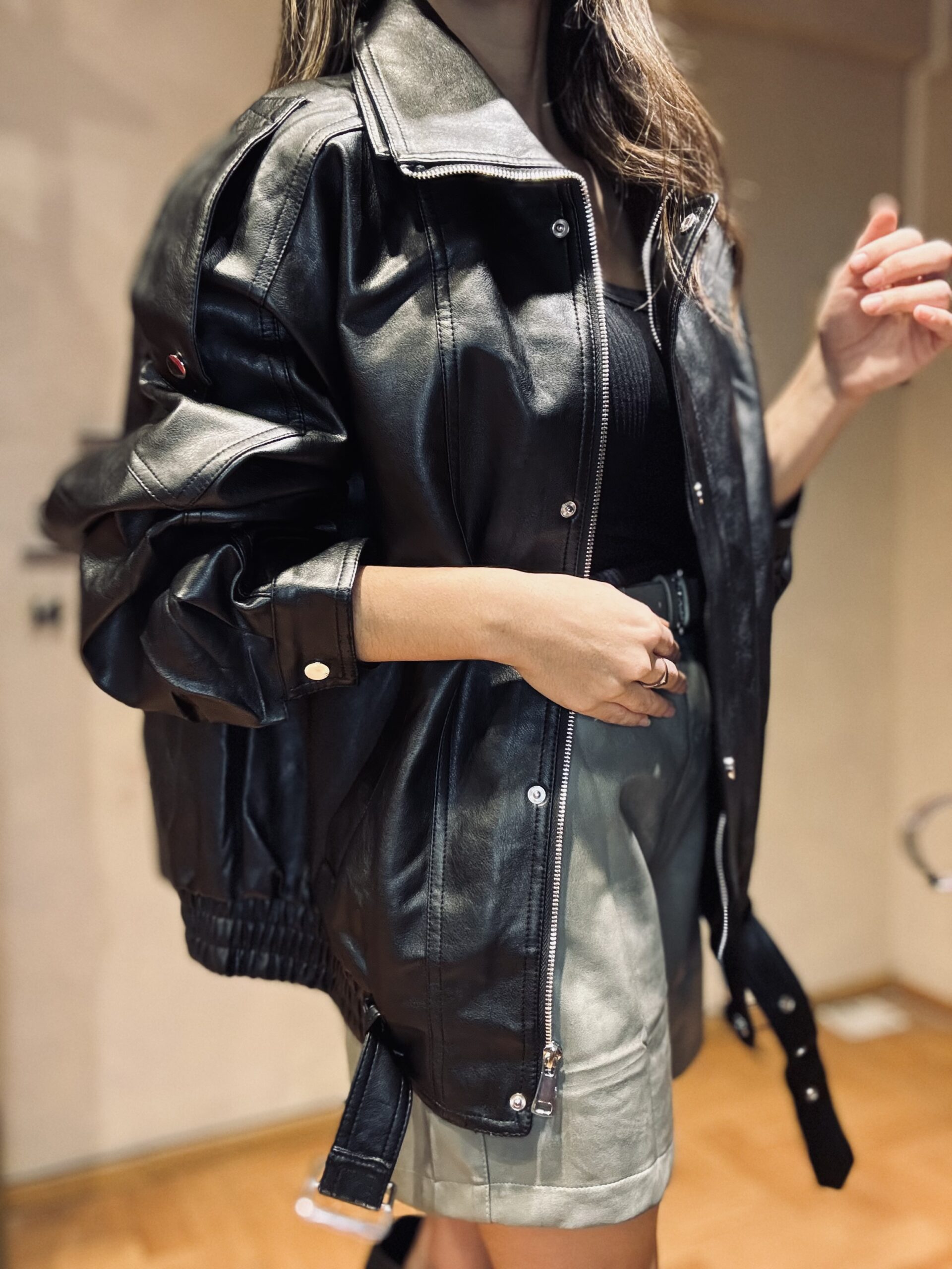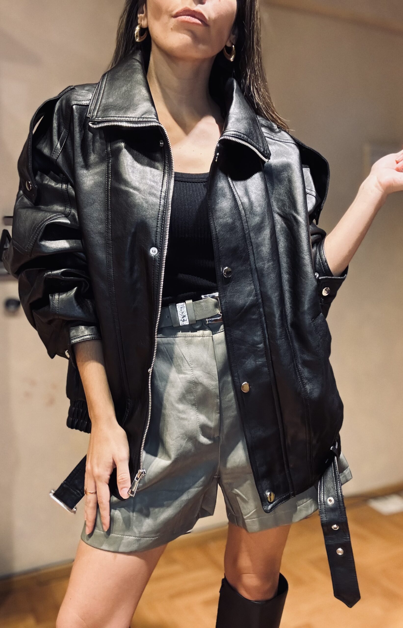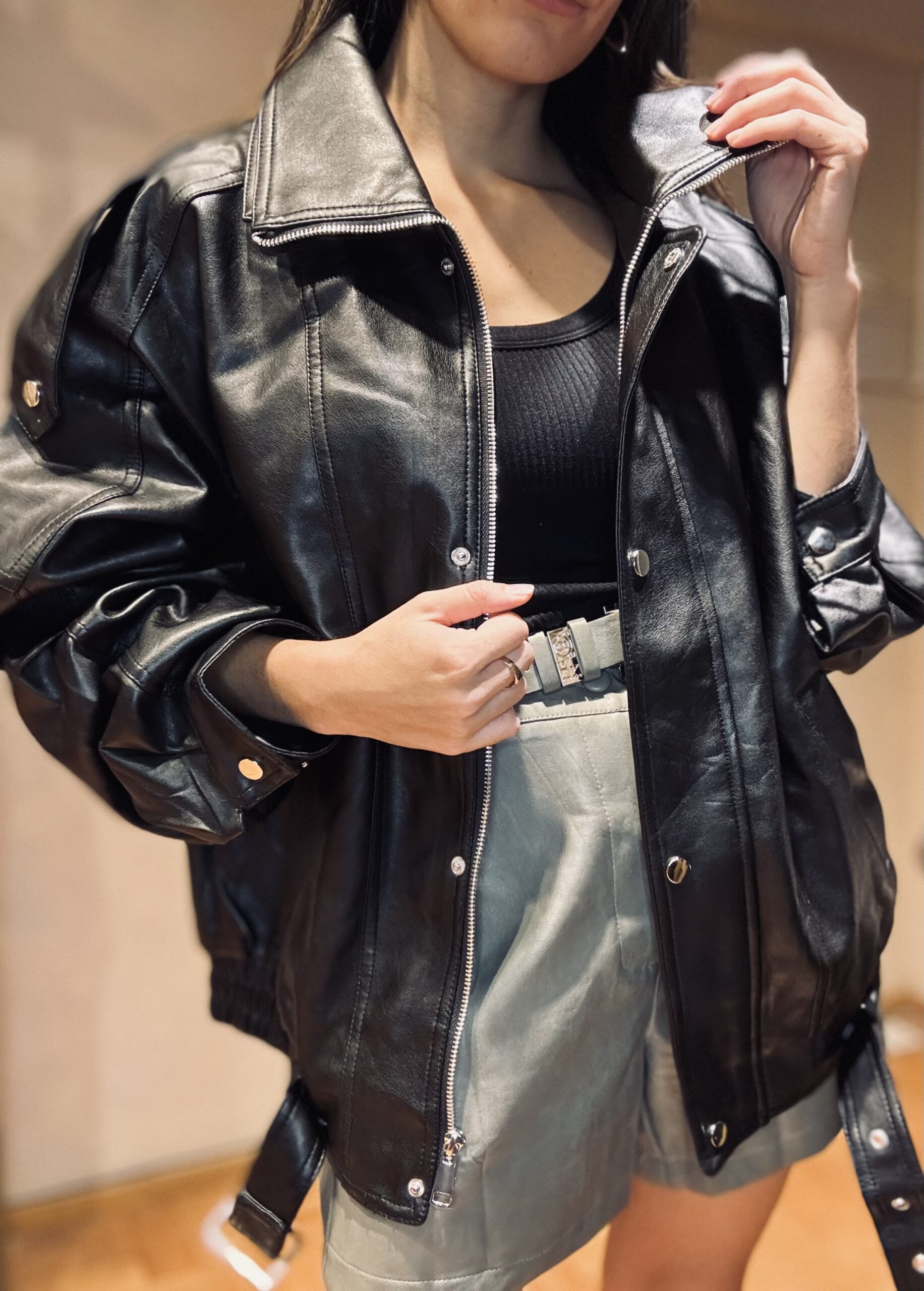 Campera de símil cuero, modelo oversize, con forreria interna, largo por debajo de la segunda cadera, con cierre y broches frontales. Abarca desde S al XL.