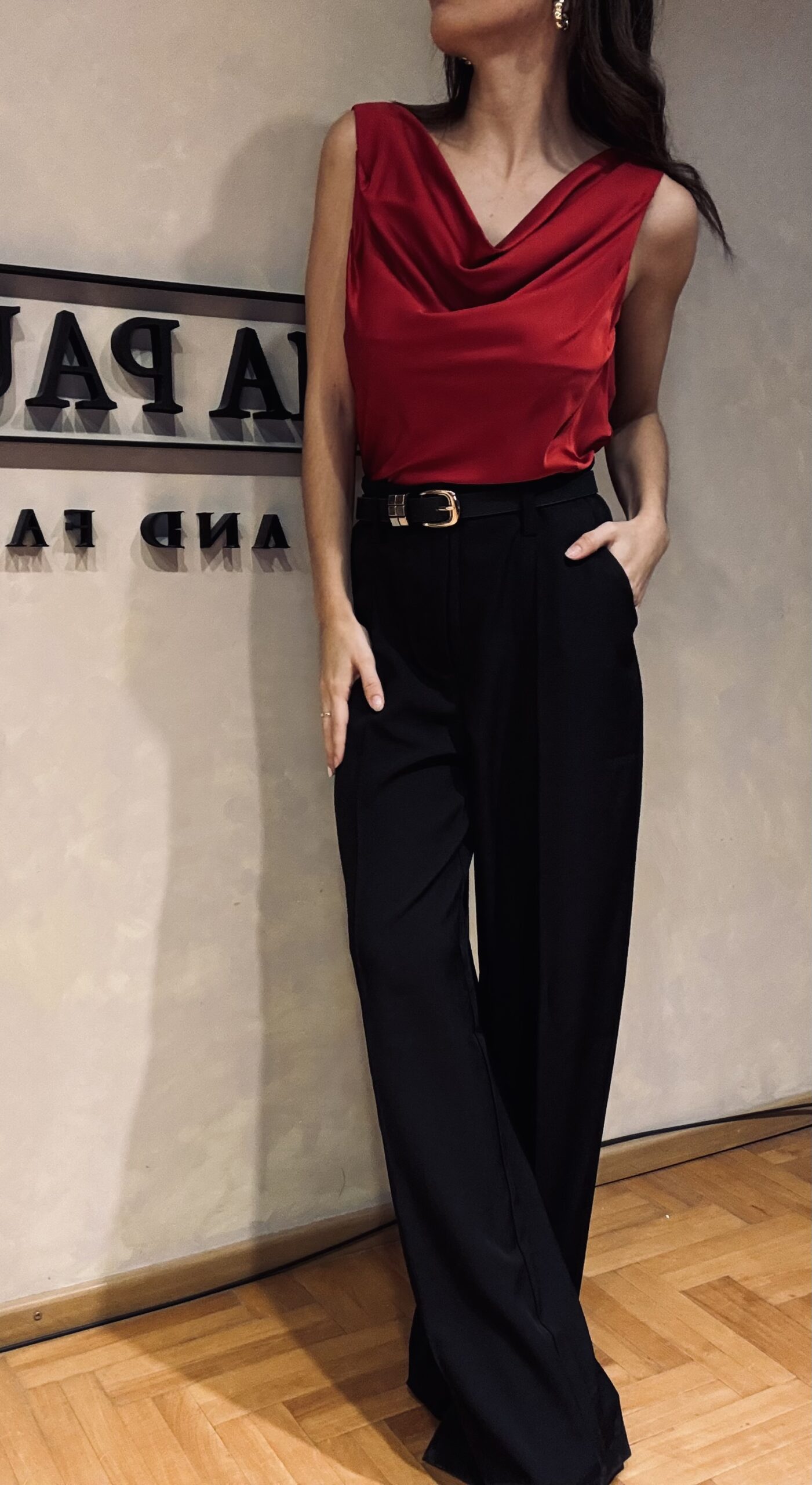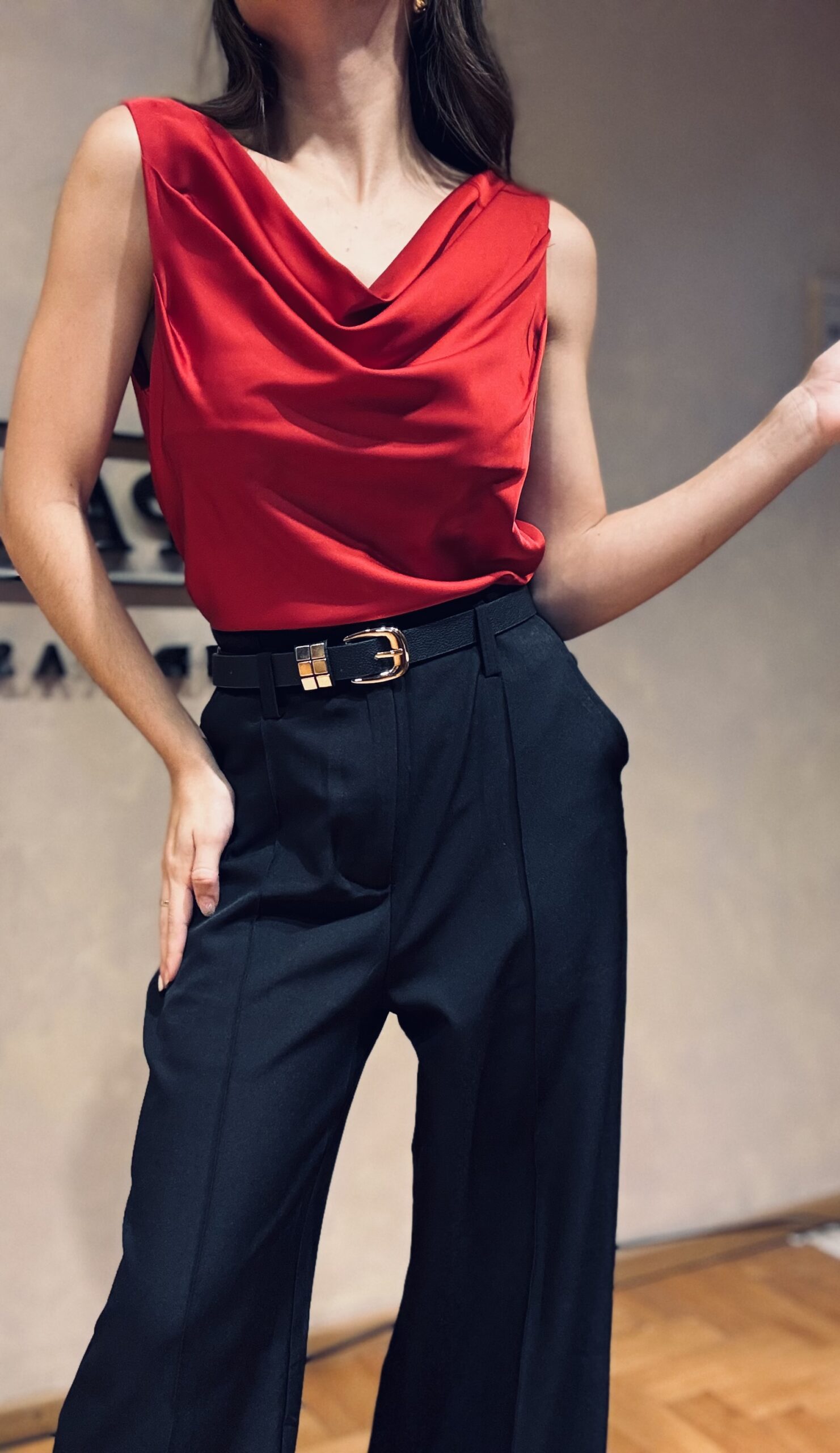 - Musculosa satinada, con escote buche, disponible del S al L.