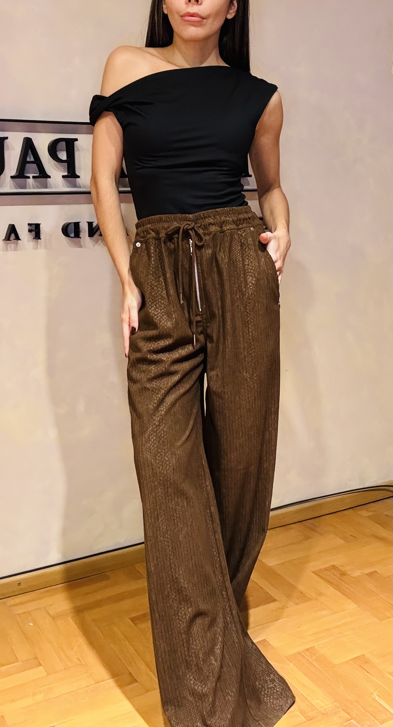Pantalón palazzo estilo jogger, con cintura elastizada y cordón para regular, detalle de cierre frontal y bolsillos delanteros. Es de símil corderoy con spandex.