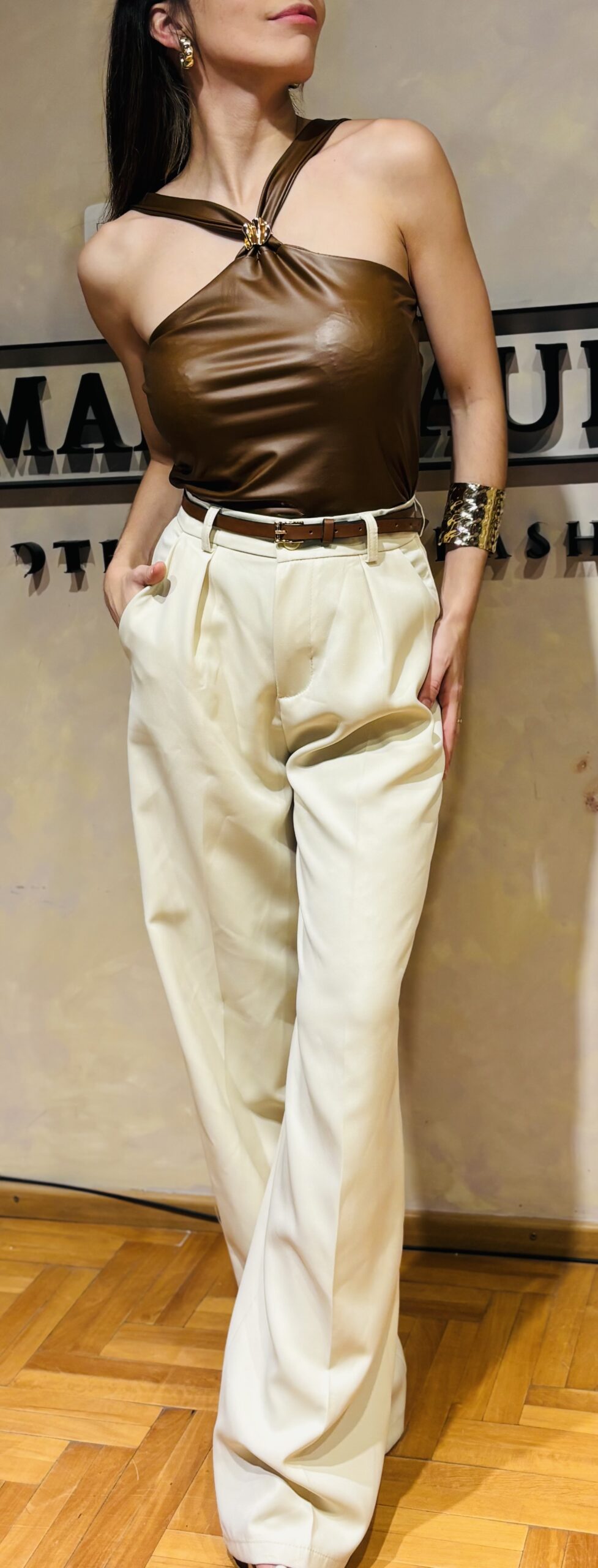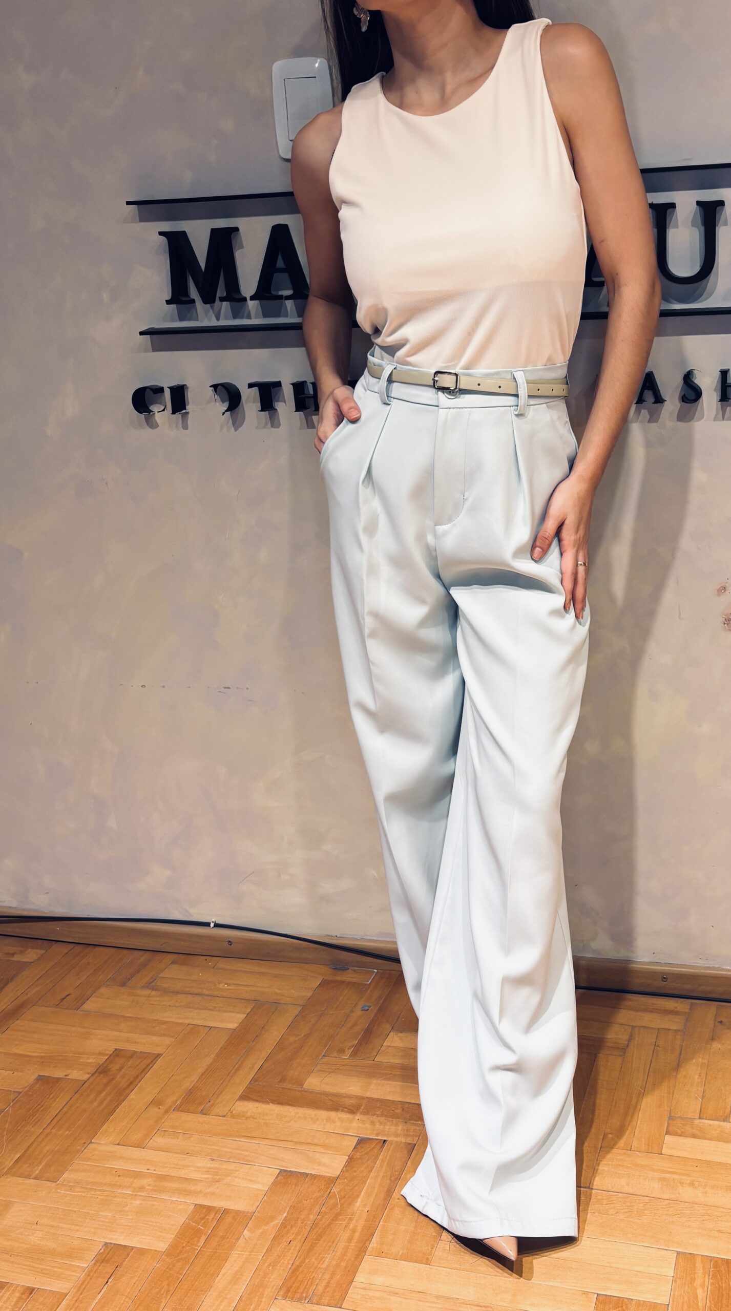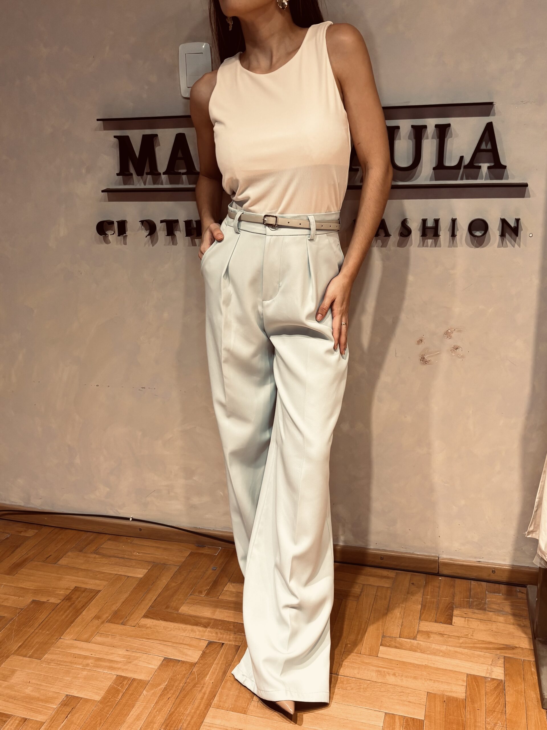 Pantalón palazzo sastrero, con pinzas y bolsillos a los costados.