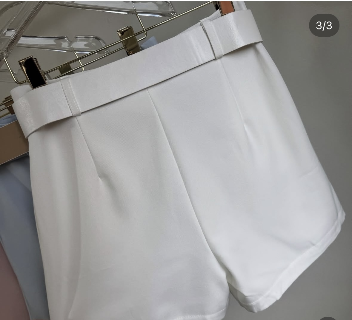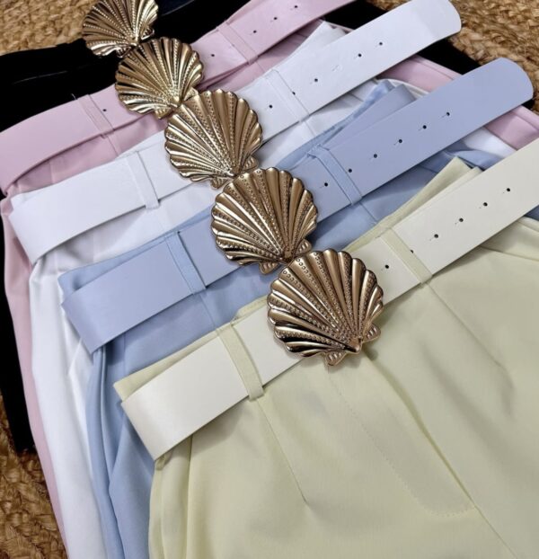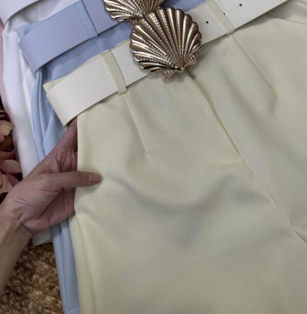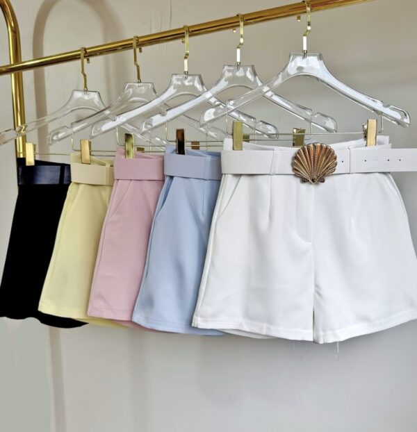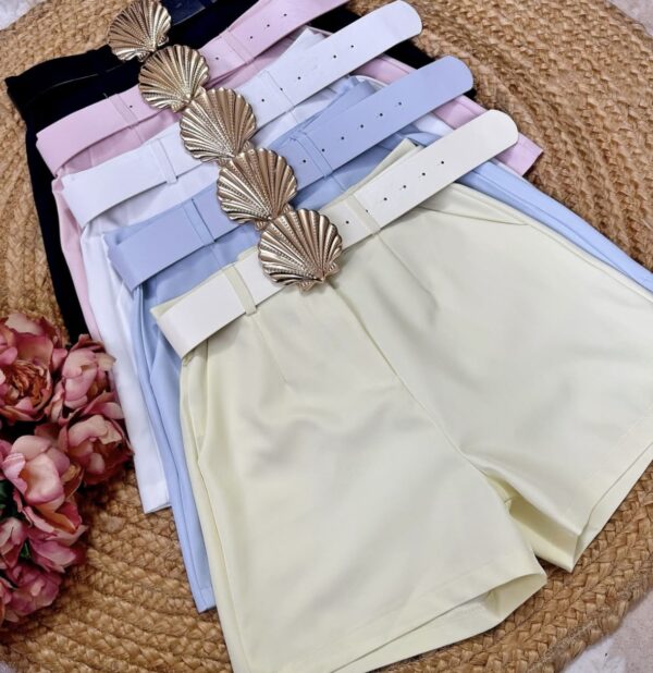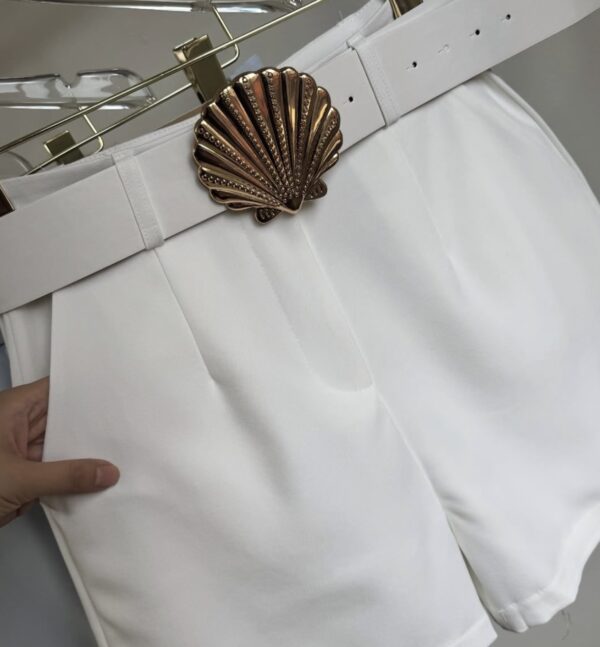 Short sastrero, con bolsillos laterales, cinturón desmontable con hebilla importante en dorado.