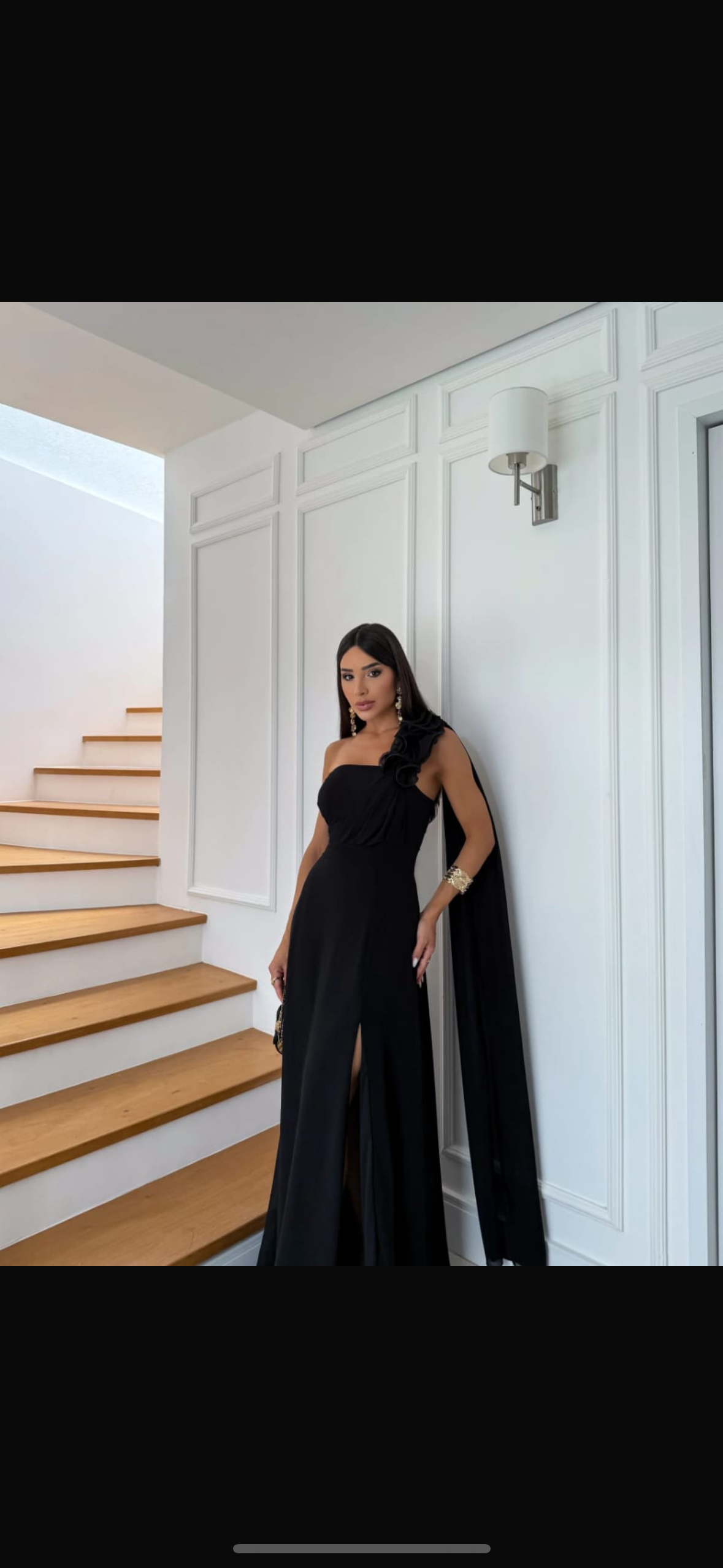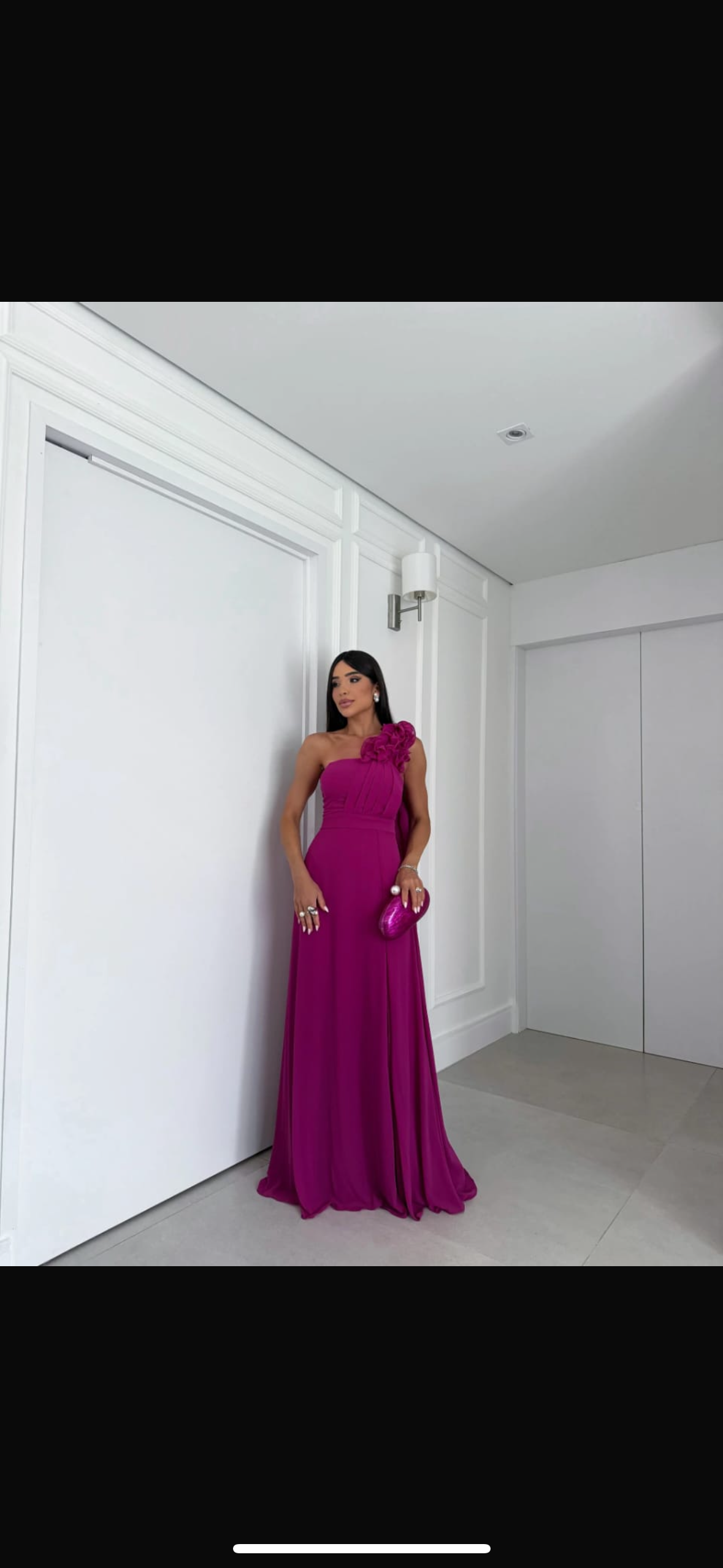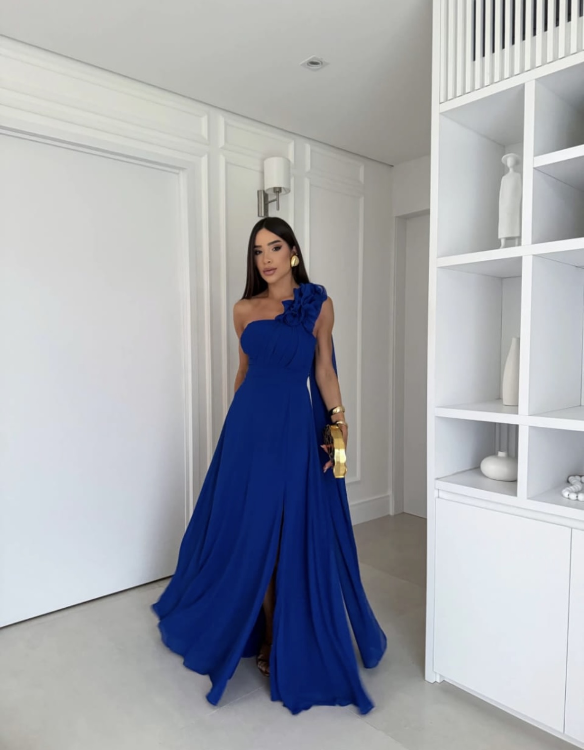 Vestido de Gaza, con forreria interna, drapeado en la zona de busto, aplique de flores y detalle de manga infinita.