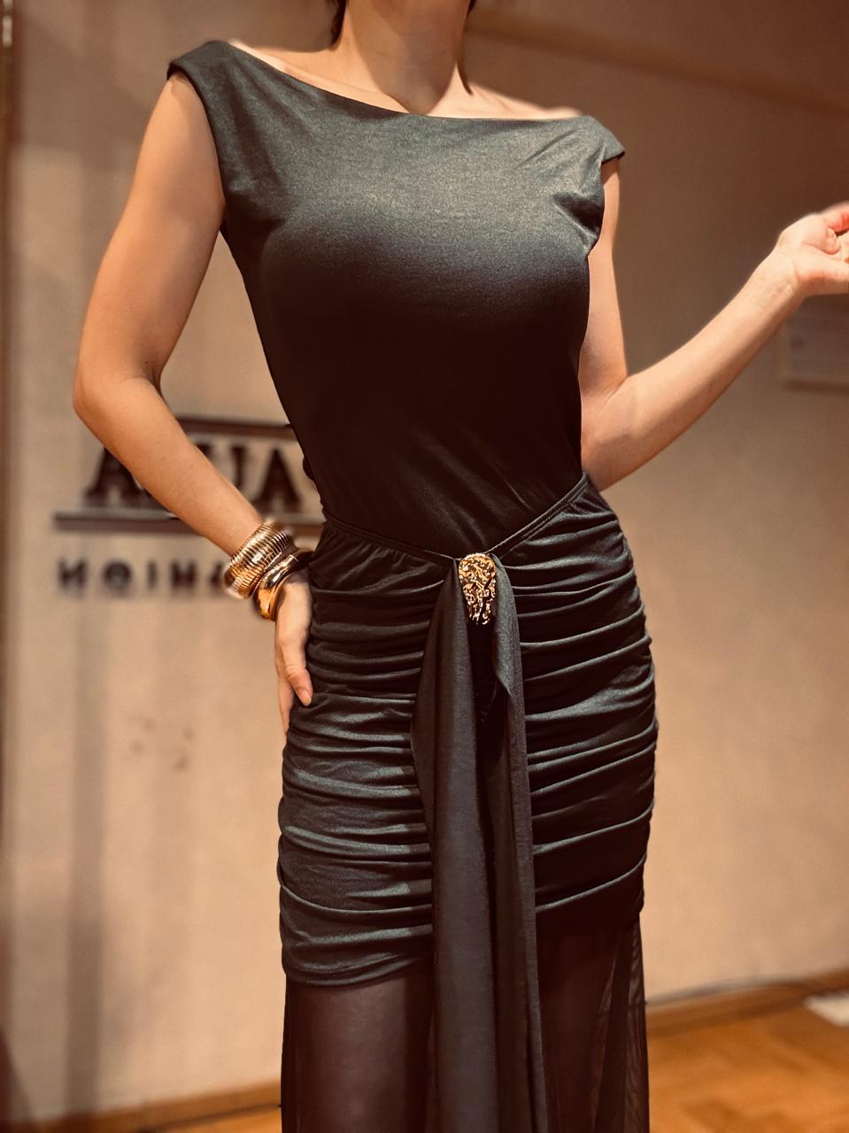 Vestido drapeado con hebilla dorada