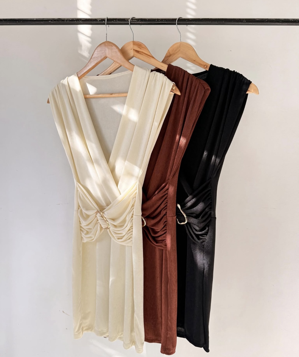 Vestido drapeado con hebilla dorada en el centro, de tela slinky , elastizado, abarca S/M.