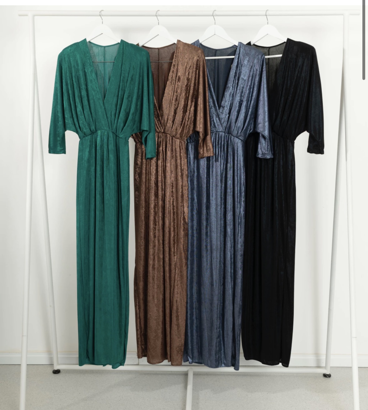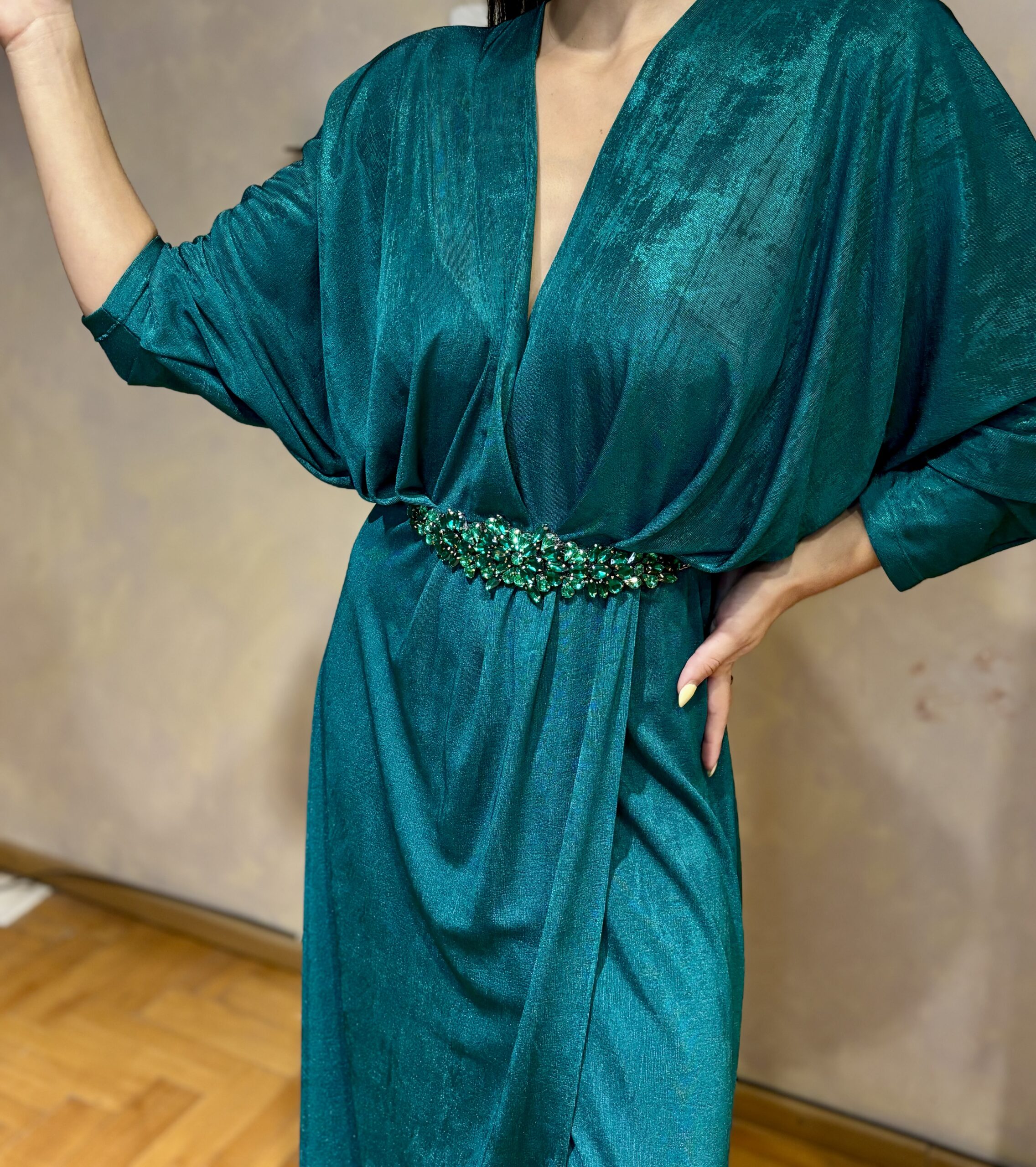 Vestido escote en V, con hombreras, mangas 3/4 tipo murciélago, corte en cintura, elastizado y tajo delantero. El talle L puede ir perfecto hasta un 44/46.
