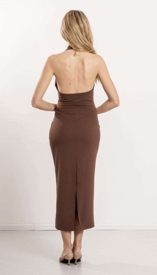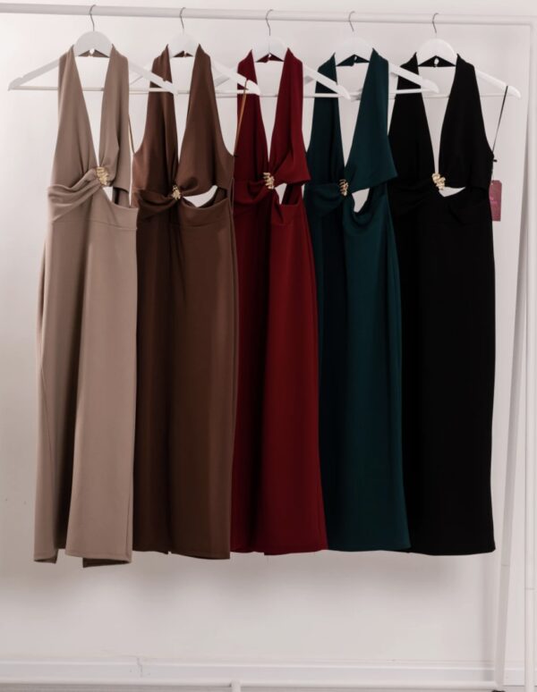 Vestido de crepé de punto, con detalle de aberturas y hebilla dorada, largo midi.