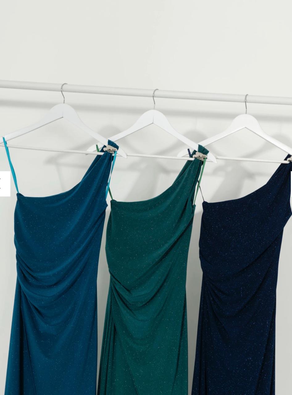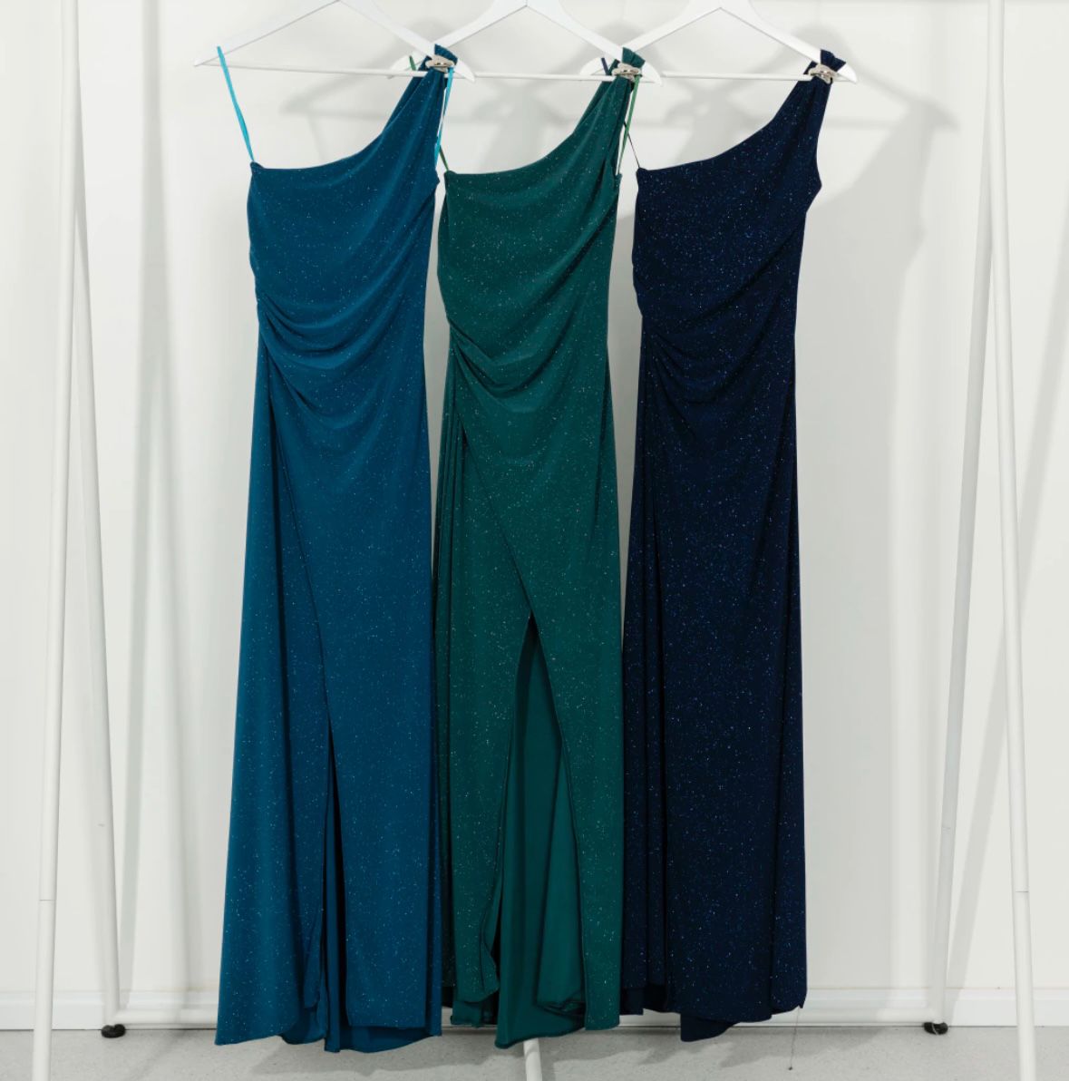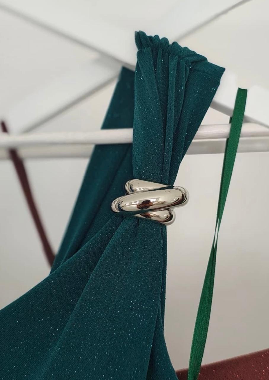 Vestido de lurex brilloso con escote asimétrico, drapeado, detalle de hebilla dorada con spandex