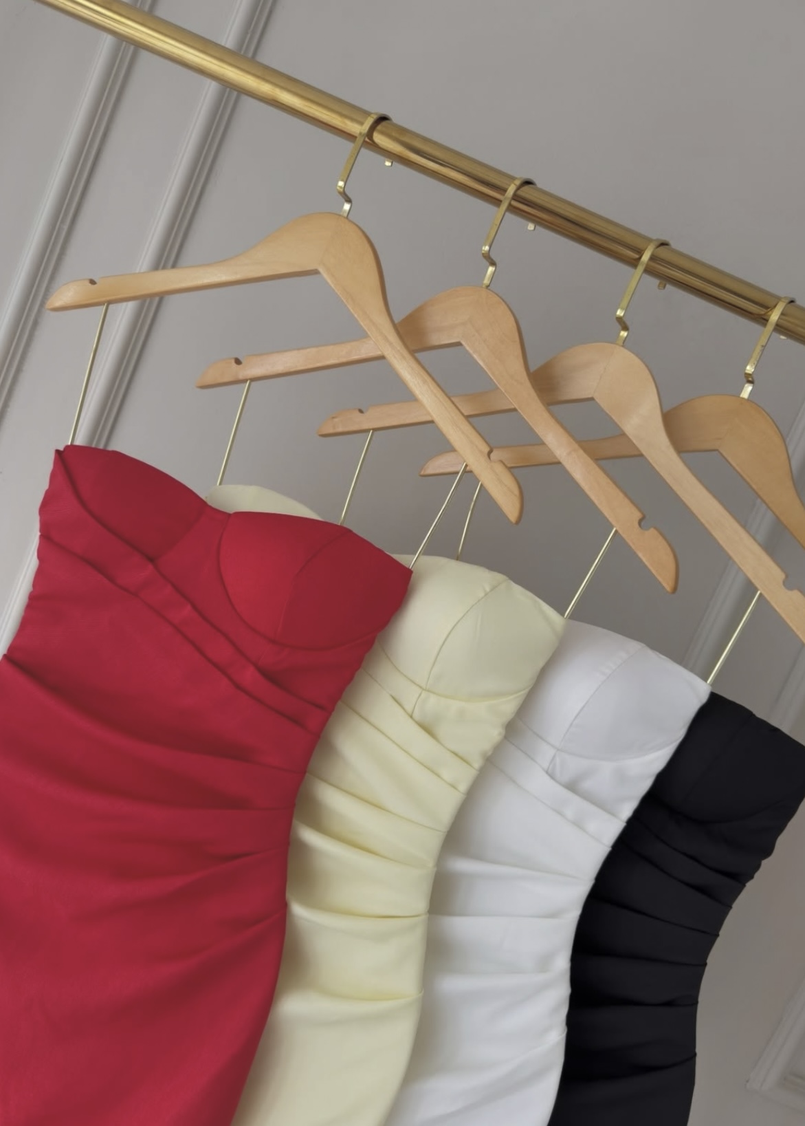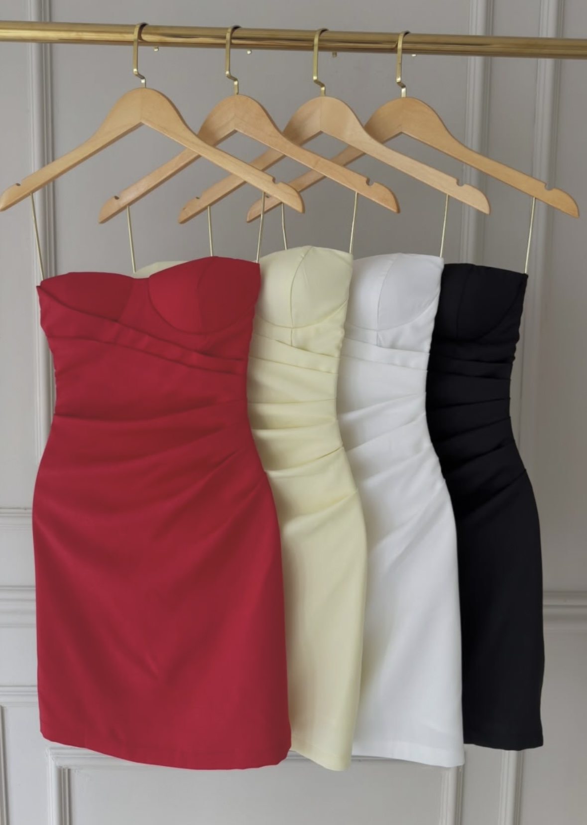 Vestido crepé sastrero strapless tipo corsé, largo arriba de las rodillas, con forreria interna y tasas incorporadas.